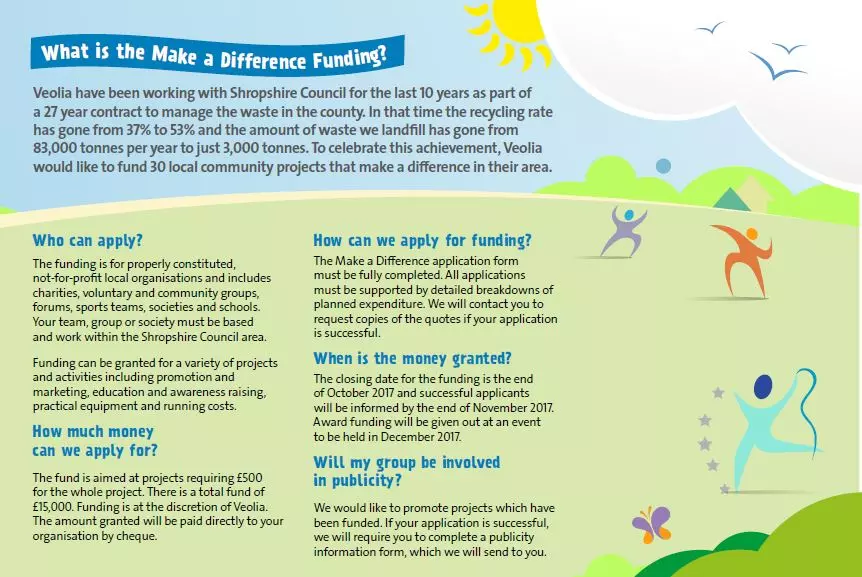 To apply please download an application form below and return to Veolia, Vanguard Way, Battlefield Enterprise Park, Shrewsbury, SY1 3TG. The deadline for applications is Friday 27 October 2017.